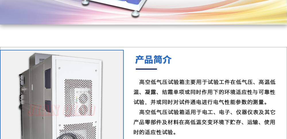用途:高空低氣壓試驗(yàn)箱主要用于試驗(yàn)工件在低氣壓、高溫低溫、凝露、結(jié)霜單項(xiàng)或同時(shí)作用下的環(huán)境適應(yīng)性與可靠性試驗(yàn),并或同時(shí)對(duì)試件通電進(jìn)行電氣性能參數(shù)的測(cè)量。高空低氣壓試驗(yàn)箱