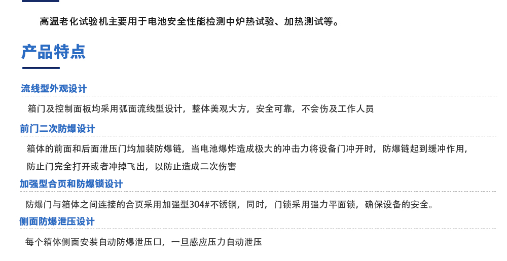 用途:高溫老化試驗(yàn)機(jī)主要用于電池安全性能檢測(cè)中爐熱試驗(yàn)、加熱測(cè)試等。
