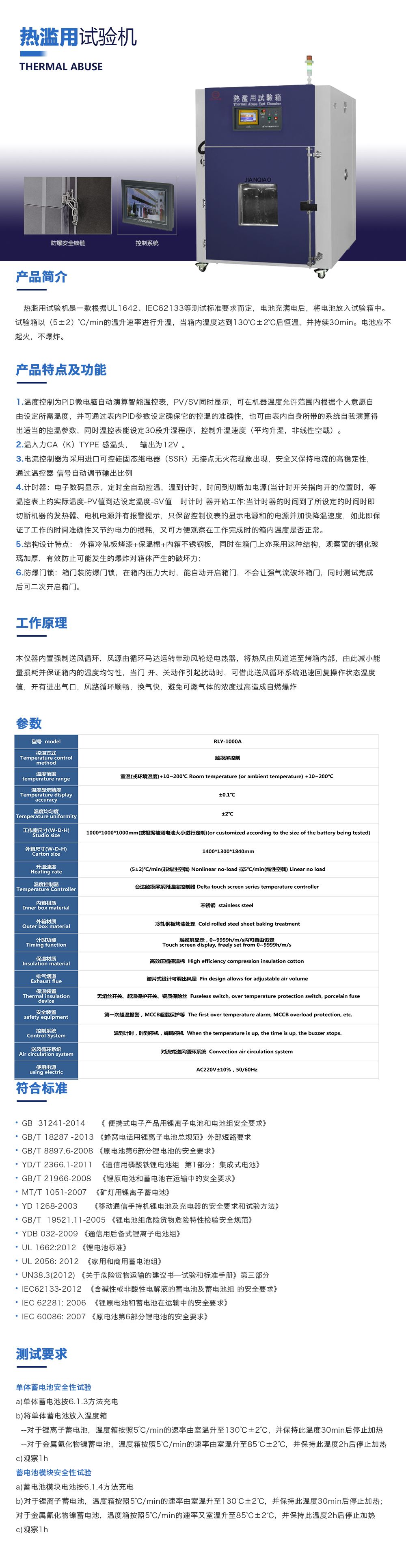 用途:熱濫用試驗箱是一款根據UL1642、IEC62133等測試標準要求而定,電池充滿電后,將電池放入試驗箱中。試驗箱以(5±2)℃/min的溫升速率進行升溫,當箱內溫度達到130℃±2℃后恒溫,并持續(xù)