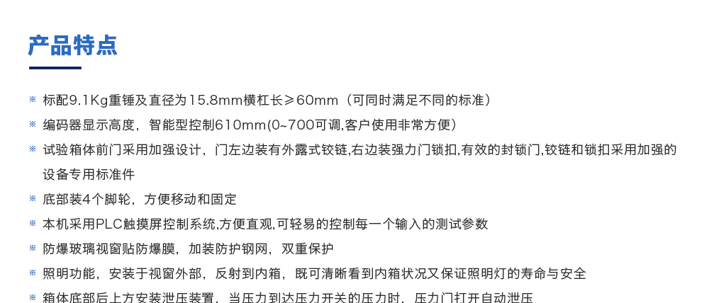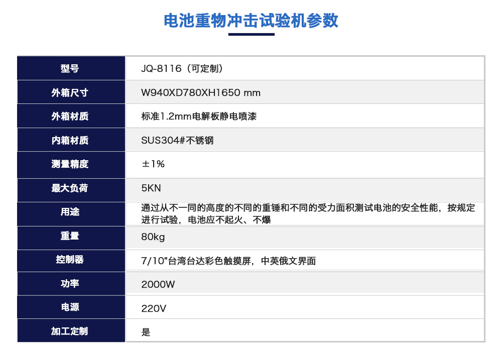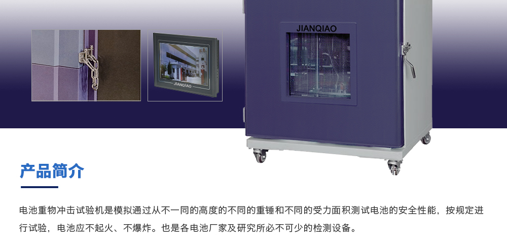 用途:電池重物沖擊試驗機是模擬通過從不一同的高度的不同的重錘和不同的受力面積測試電池的安全性能,按規(guī)定進行試驗,電池應(yīng)不起火、不爆炸。也是各電池廠家及研究所必不可少的檢