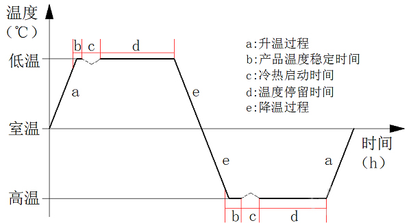 熱循環(huán)試驗是一種利用高低溫交變濕熱試驗箱對試驗產品進行的預設高低溫交替的應力考核,用以驗證材料和產品是否達到在研發(fā)、設計、制造中預期的質量目標的一類可靠性試驗。通過大溫變速率可暴露產品潛在的材料與性能缺陷,經過不斷地質量改進,達到可靠性提升的目的。航天單機類產品一次熱循環(huán)示意圖見下圖1所示。