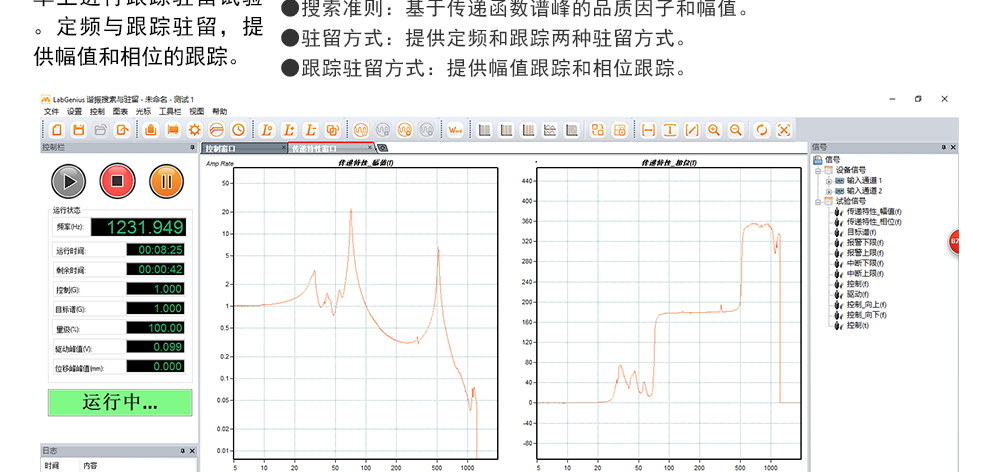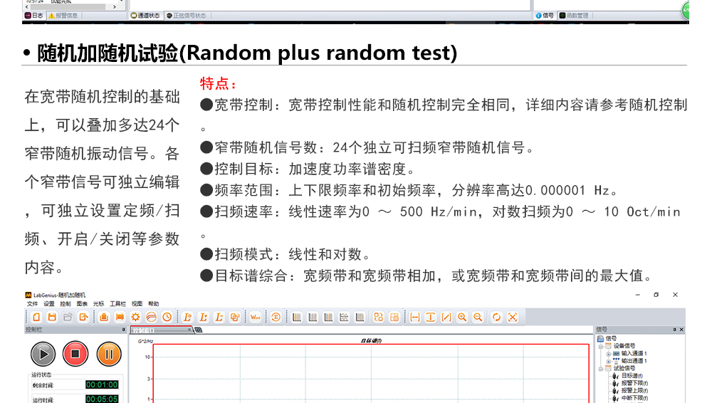 用途:正弦試驗可以控制振動臺實現(xiàn)定頻(駐留)、掃頻等振動試驗。控制算法中采用了跟蹤濾波的幅值以及相位檢測算法,可以實現(xiàn)對控制信號的準(zhǔn)確反饋以及實時的閉環(huán)控制。