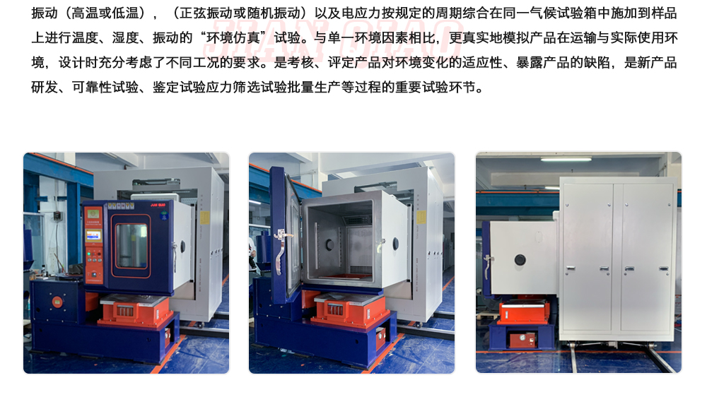 用途:垂直+水平振動高低溫三綜合箱(JQTHV-500):主要是試驗箱和振動試驗系統(tǒng)的綜合,試驗時將溫度、濕度、振動(高溫或低溫),(正弦振動或隨機(jī)振動)以及電應(yīng)力按規(guī)定的周期綜合在同一氣候試驗箱中施加到樣品上進(jìn)行溫度、濕度、振動的“環(huán)境仿真”試驗。