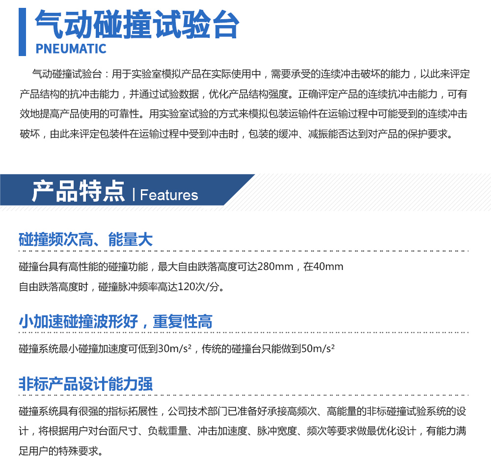 用途:氣動碰撞試驗臺:用于實驗室模擬產(chǎn)品在實際使用中,需要承受的連續(xù)沖擊破壞的能力,以此來評定產(chǎn)品結(jié)構(gòu)的抗沖擊能力,并通過試驗數(shù)據(jù),優(yōu)化產(chǎn)品結(jié)構(gòu)強度。正確評定產(chǎn)品的連續(xù)
